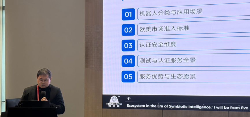 最后,来自TÜV莱茵的资深认证专家李勤先生以“标准与信任——共建具身智能时代的产业新生态”为题进行了主旨报告。他系统地介绍了机器人分类与应用场景、服务机器人欧美市场准入法规、助理机器人安全等级分级及评估流程等内容,并介绍了TÜV莱茵可提供的测试与认证服务。