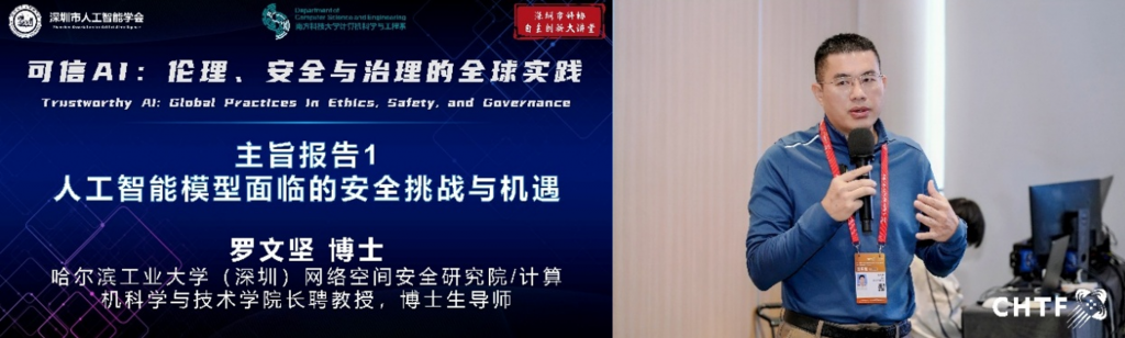 在主旨报告环节,哈尔滨工业大学(深圳)网络空间安全研究院/计算机科学与技术学院长聘教授罗文坚以《人工智能模型面临的安全挑战与机遇》作首场报告。罗文坚教授从计算机视觉、大语言模型、多模态、深度强化学习与分布式学习等多类型模型出发,系统梳理算法安全、内容可信及隐私保护等方面的挑战,并分享了相应的应对策略。