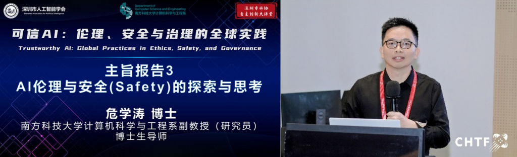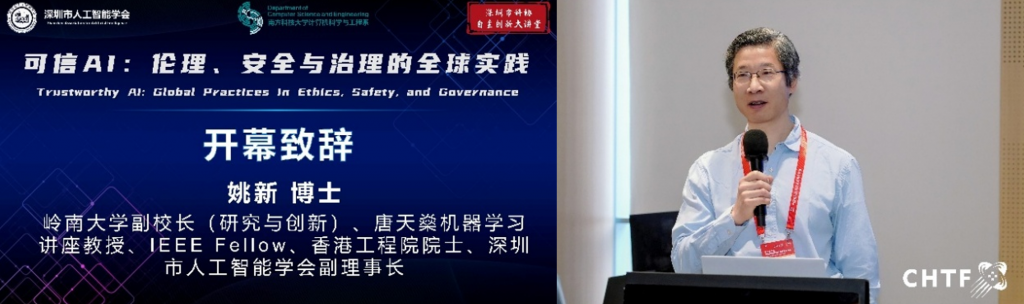 2025年11月14日,第二十七届中国国际高新技术成果交易会(高交会)重要学术活动“AI新质生产力:前沿突破与产业引领”高峰论坛在深圳国际会展中心隆重举行,其中特设的“可信AI:伦理、安全与治理的全球实践”沙龙于当日11:00—13:00在14号会议室C厅成功举办。活动由深圳市科学技术协会指导,深圳市人工智能学会主办,深圳市人工智能学会AI伦理治理专委会与南方科技大学计算机科学与工程系承办。沙龙由岭南大学副校长、唐天燊机器学习讲座教授、IEEE Fellow、香港工程院院士姚新,腾讯研究院高级研究员、深圳市人工智能学会AI伦理治理专委会副主任曹建峰,南方科技大学计算机科学与工程系研究副教授、深圳市人工智能学会AI伦理治理专委会秘书长黄长武共同担任主席。