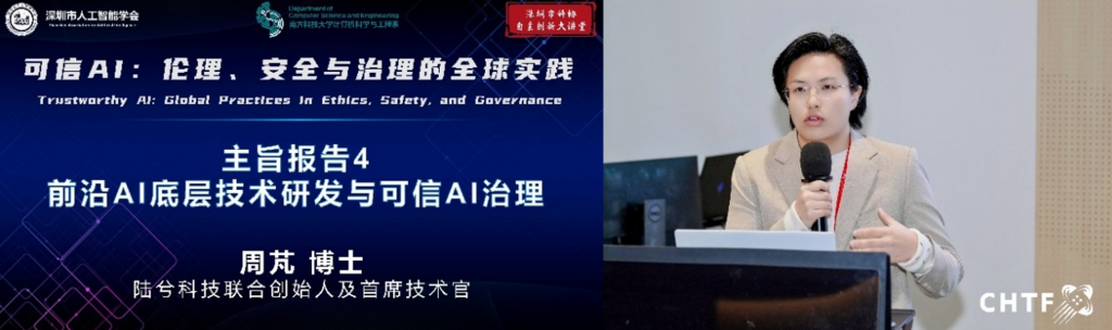 陆兮科技联合创始人及首席技术官周芃博士以《前沿AI底层技术研发与可信AI治理》为题,从大模型的缩放定律(Scaling Law)、底层架构、算法机制等技术脉络出发,阐述了类脑大模型技术路线的效率优势,并强调了技术治理与合规设计的重要性。