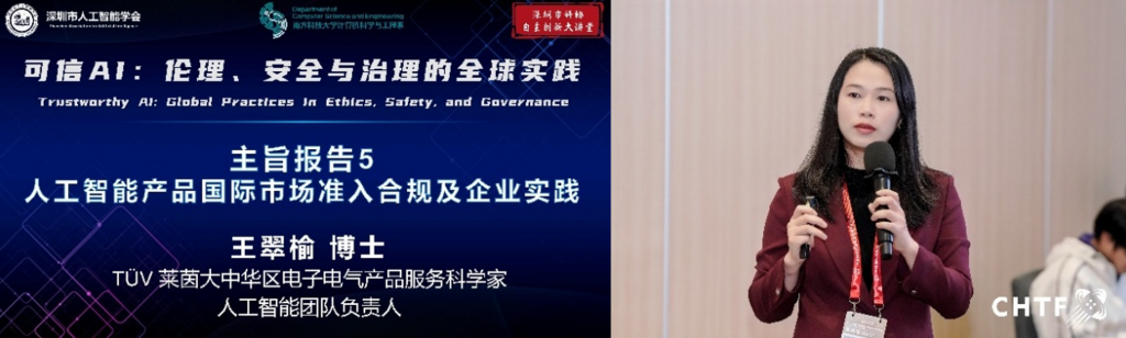 最后,TÜV莱茵大中华区电子电气产品服务科学家、人工智能团队负责人王翠榆博士作了《人工智能产品国际市场准入合规及企业实践》专题分享,解读了欧盟《人工智能法案》等新规下的风险导向监管要求,梳理从禁止性实践到高风险系统的分层合规框架,倡导企业在设计早期嵌入合规策略,完善性能与安全验证,构建全生命周期治理闭环,提升国际市场可信度与竞争力。